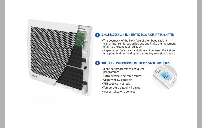 The radiator automatically detects a drop in temperature due to a window opening and stops to avoid unnecessary consumption. Hyper programmable