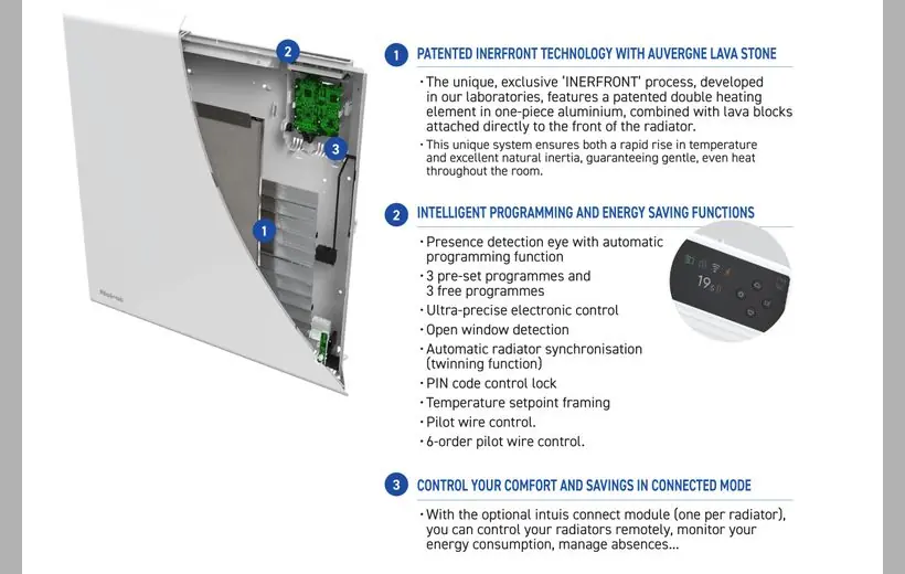 Radiator natively connected and controllable remotely (with the INTUIS CONNECT gateway available as an option).