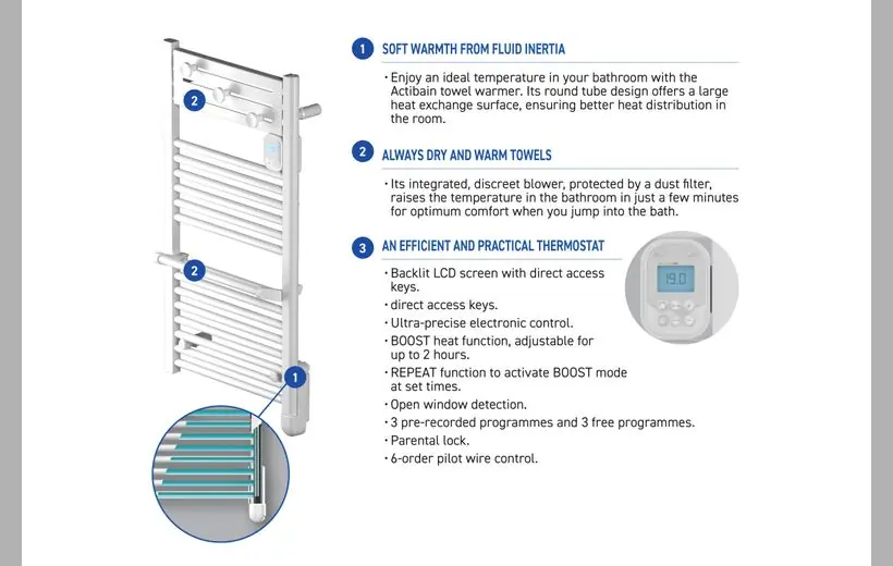 Towels or bathrobes, for children and adults, Actibain comes with a complete kit of accessories that allows for a large drying capacity. 3 sliding hooks are fixed at the top and 1 tilting bar*. Towels are also easy to slide between the bars. * On the 750 and 1750W models it is even possible to add a second tilting bar for even more drying space (bar available as an option)The gentle, enveloping warmth that comforts you when you get out of the bath