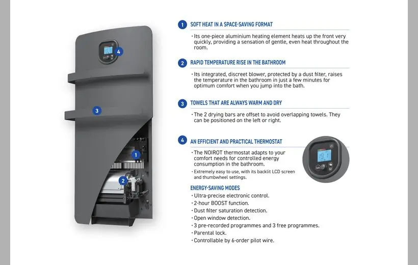 The internal, single-piece aluminum heating element naturally heats the facade and maintains the temperature for guaranteed comfort. A built-in blower, protected by a dust filter, boosts comfort at the desired times.